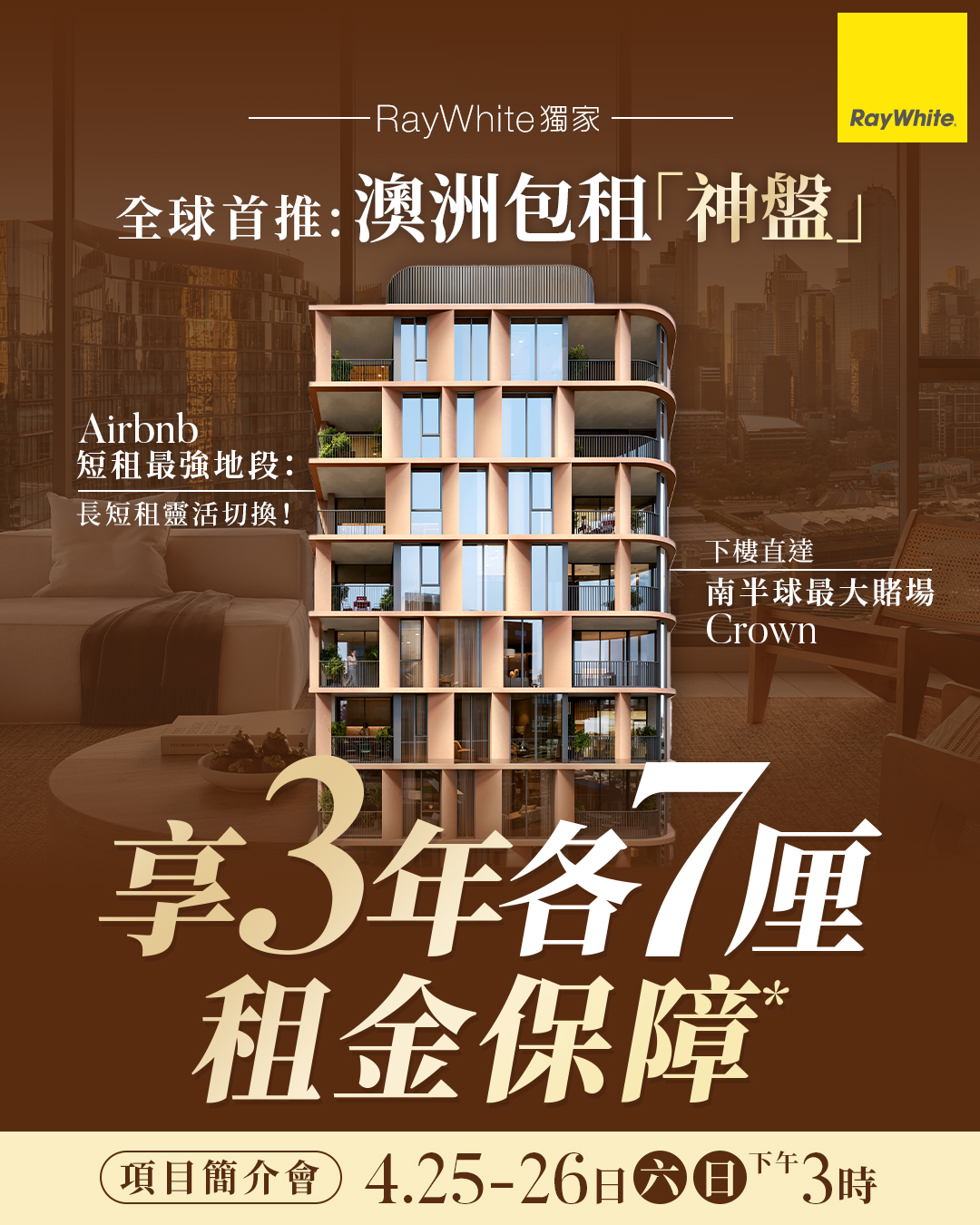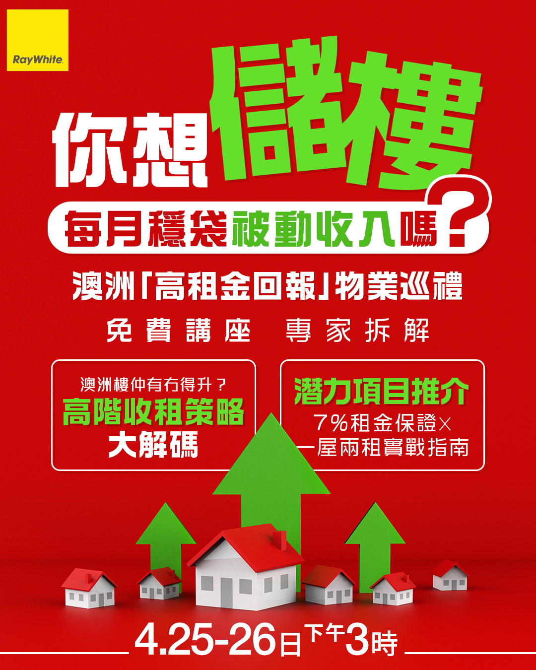 Ray White 香港為您帶來獨家免費入市講座,由資深澳洲物業專家親自開講,帶您發掘 2026 年澳洲最強的收租王牌,教您如何輕鬆實現「以租養貸」!