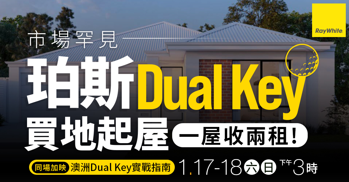 1月17至18日 (六、日) ,Ray White舉辦「珀斯專題房產展」,為大家帶來最新入市攻略分析,市場數據分析及樓市預測。同場加映「珀斯買地起屋精讀班」,由專家深入解構「買地起屋 」優勢及玩法Step-by-Step完整教學,更會詳盡分析澳幣低水下的澳洲樓市及投資策略!屆時亦會推介珀斯的高性價比「買地起屋 」項目。現場介紹「Dual Key」新玩法,教路如何將普通的買地起屋方案以「一拆二」的形式建造及放租,實現「一間屋,收兩份租」的租值最大化竅門。立即登記啦!