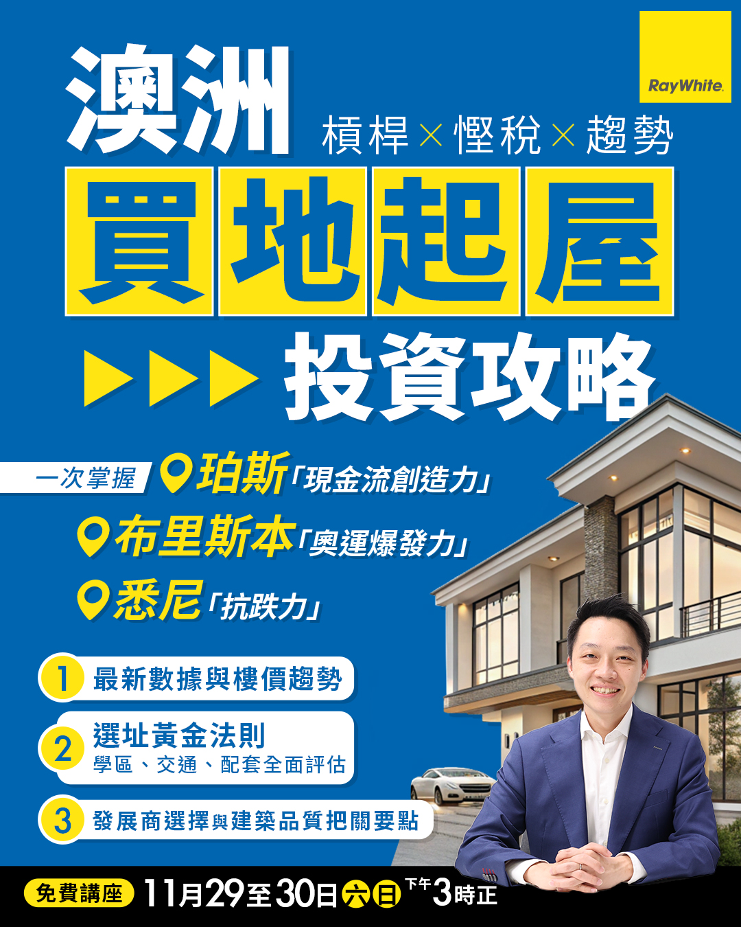 移民、回流、投資者必睇!Ray White今期特設澳洲三大城市買地起屋聯展,聚焦新鐵路沿線潛力地區以及港人至愛地段,比你一次過睇哂珀斯、悉尼和布里斯本各大熱門地區的屋連地項目。隨著減息政策推動下,借貸成本下降吸引更多買家進入市場,反映市場活躍度上升。