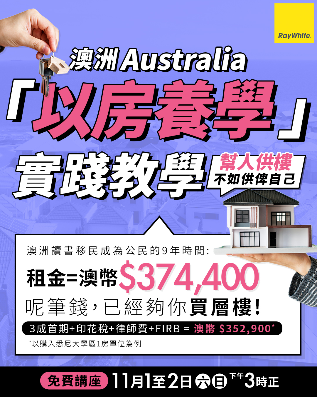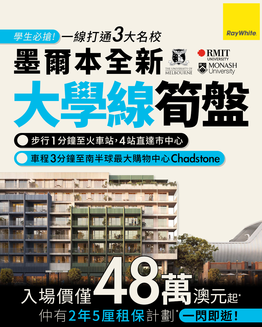 萬勿錯過澳洲大學區新盤巡禮,全面覆蓋各大城市、各大學區全新現樓、準現樓及樓花項目,悉尼、墨爾本、布里斯本、阿德萊德及珀斯精選新盤,特低入場價 240萬港元起*。Ray White舉辦免費講座,講解入市澳洲大學區物業訣竅,從投資自用雙角度出發析,並會分享真實案例、投資攻略、新盤速遞、市場快訊。