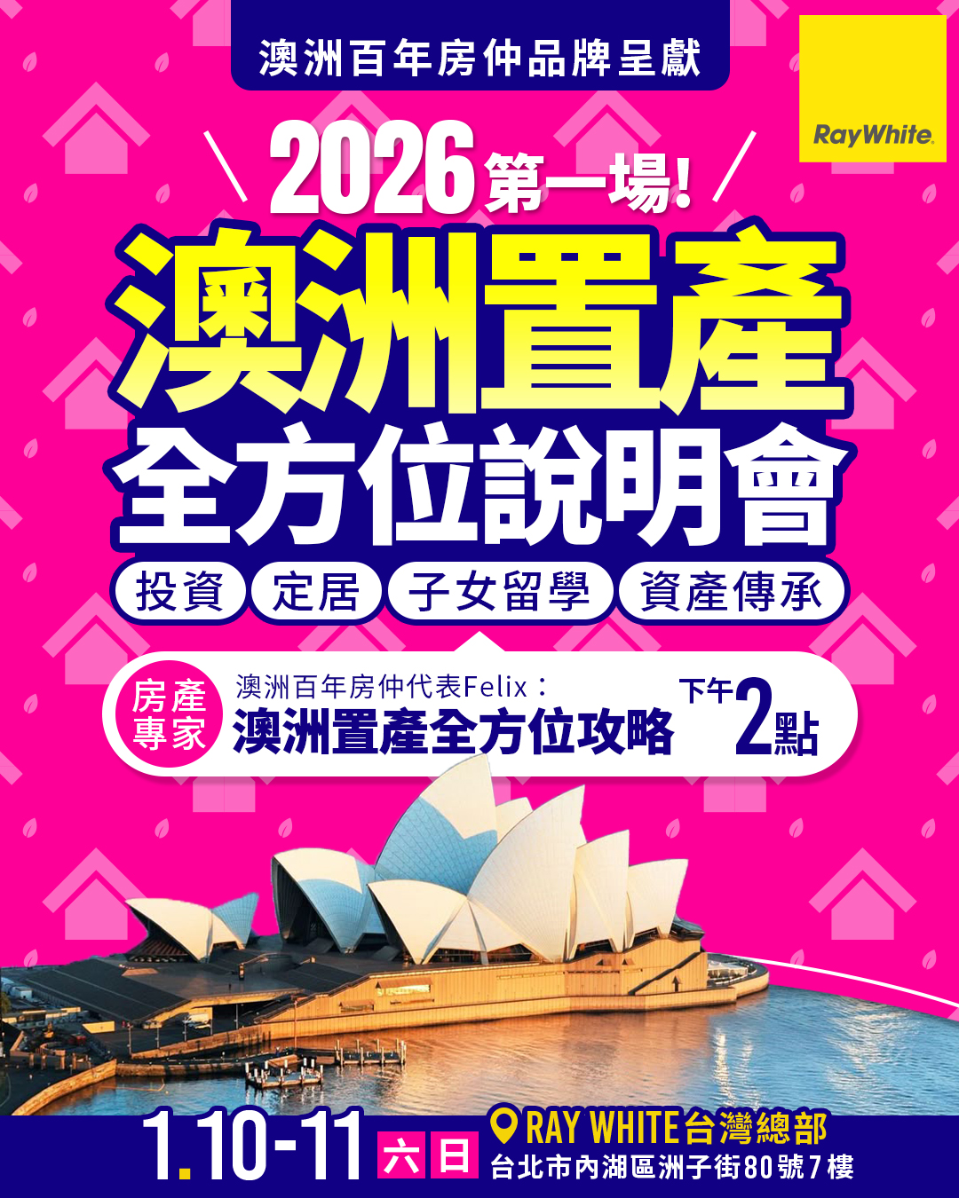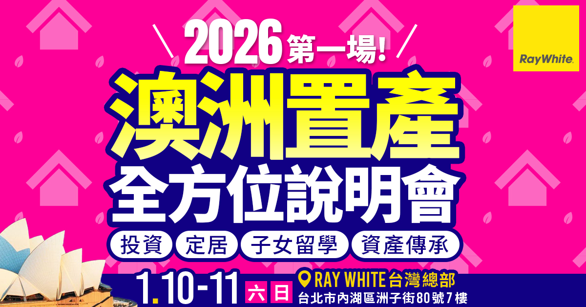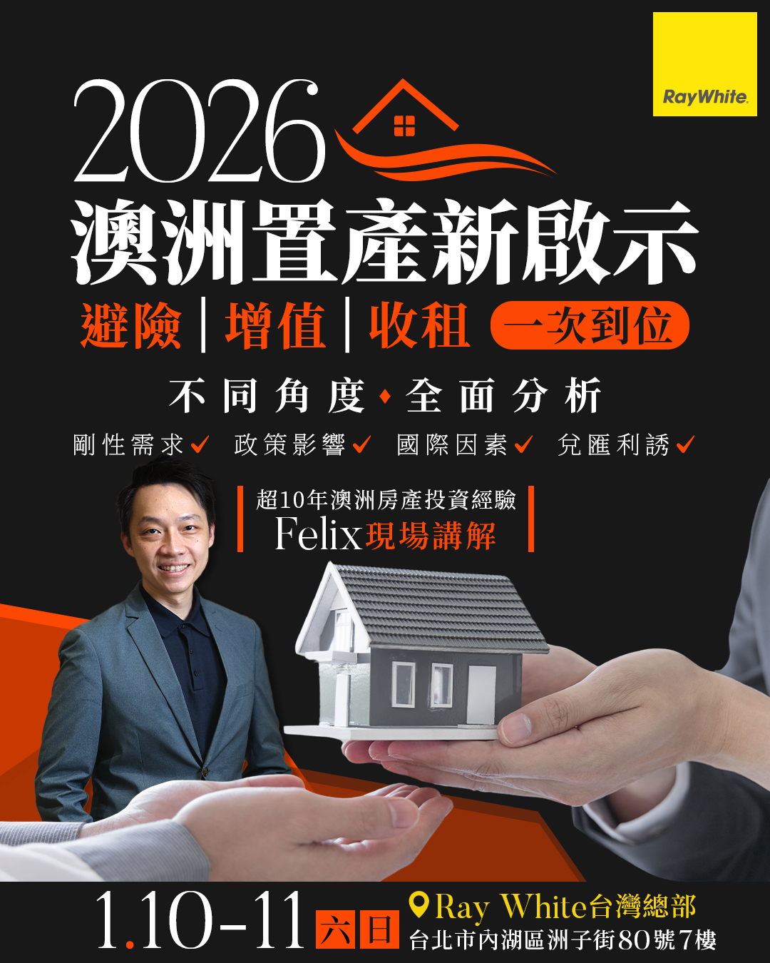 從宏觀到微觀,從趨勢分析到實戰操作 – 擁百年歷史的澳洲品牌Ray White主辦免費「澳洲房產入門實戰班」,一站式掌握澳洲置產關鍵,為您的資產布局開啟國際視野!無需飛往澳洲!在地深度解析,由澳洲最大房產集團Ray White當地專家與台灣團隊聯手,為您提供從選房、貸款、稅務到代管的真正一條龍服務,安全穩健踏出海外置產第一步。