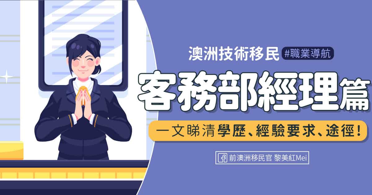 客務部經理這種職業都在中長期和偏遠地區的職業列表上,可以考慮以190、491等技術移民簽證移民澳洲。