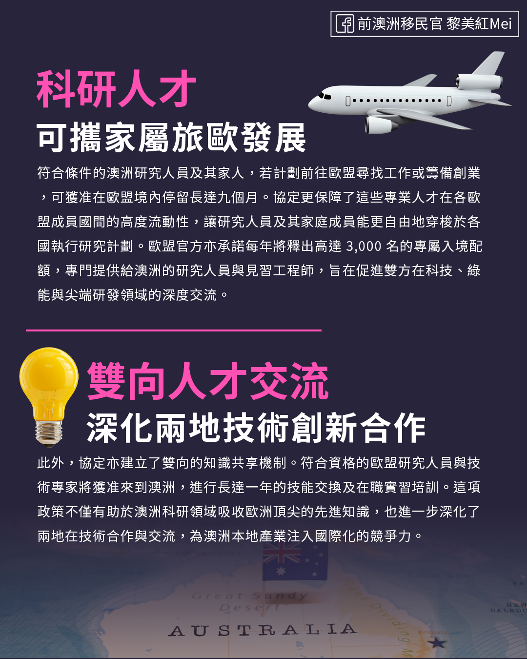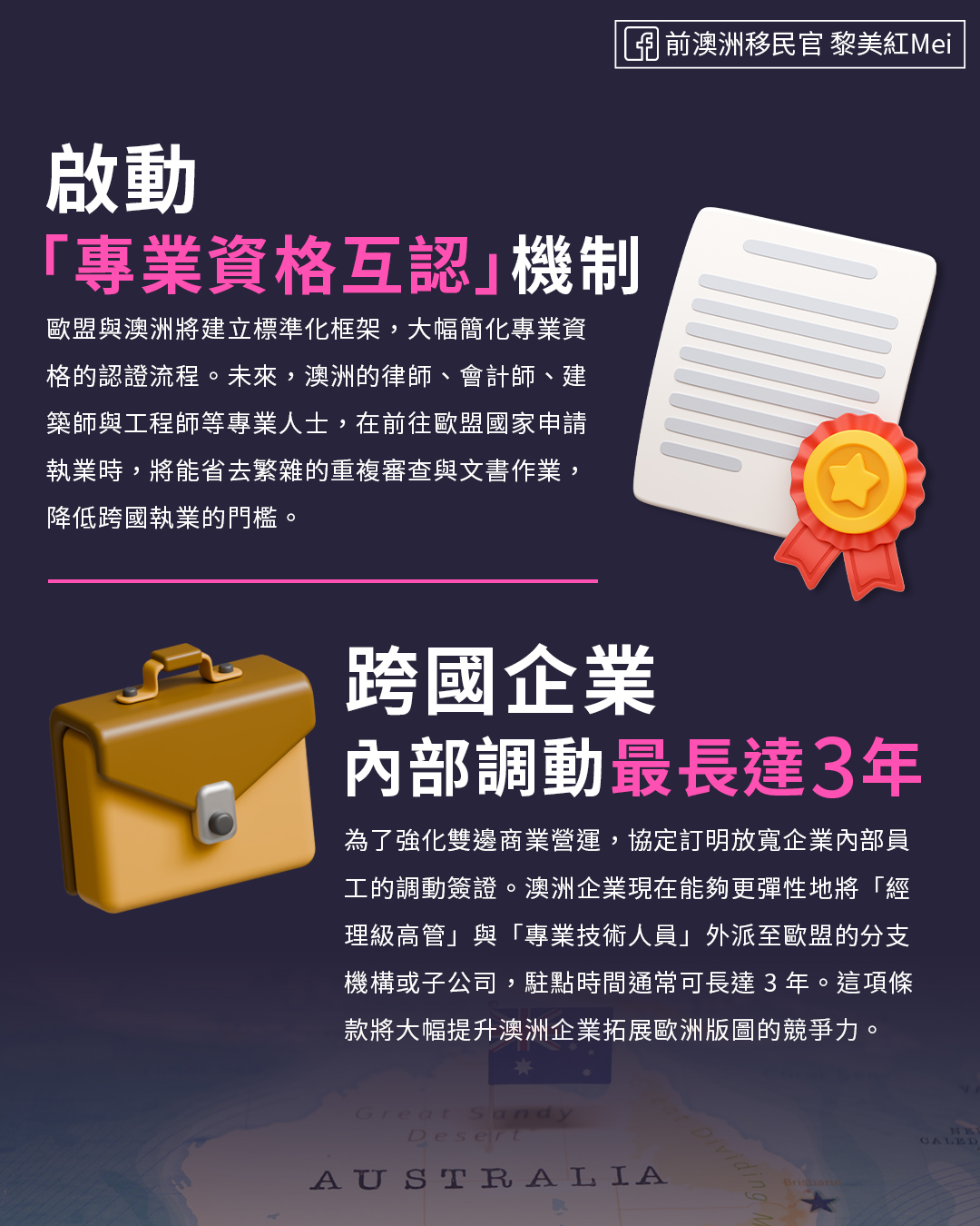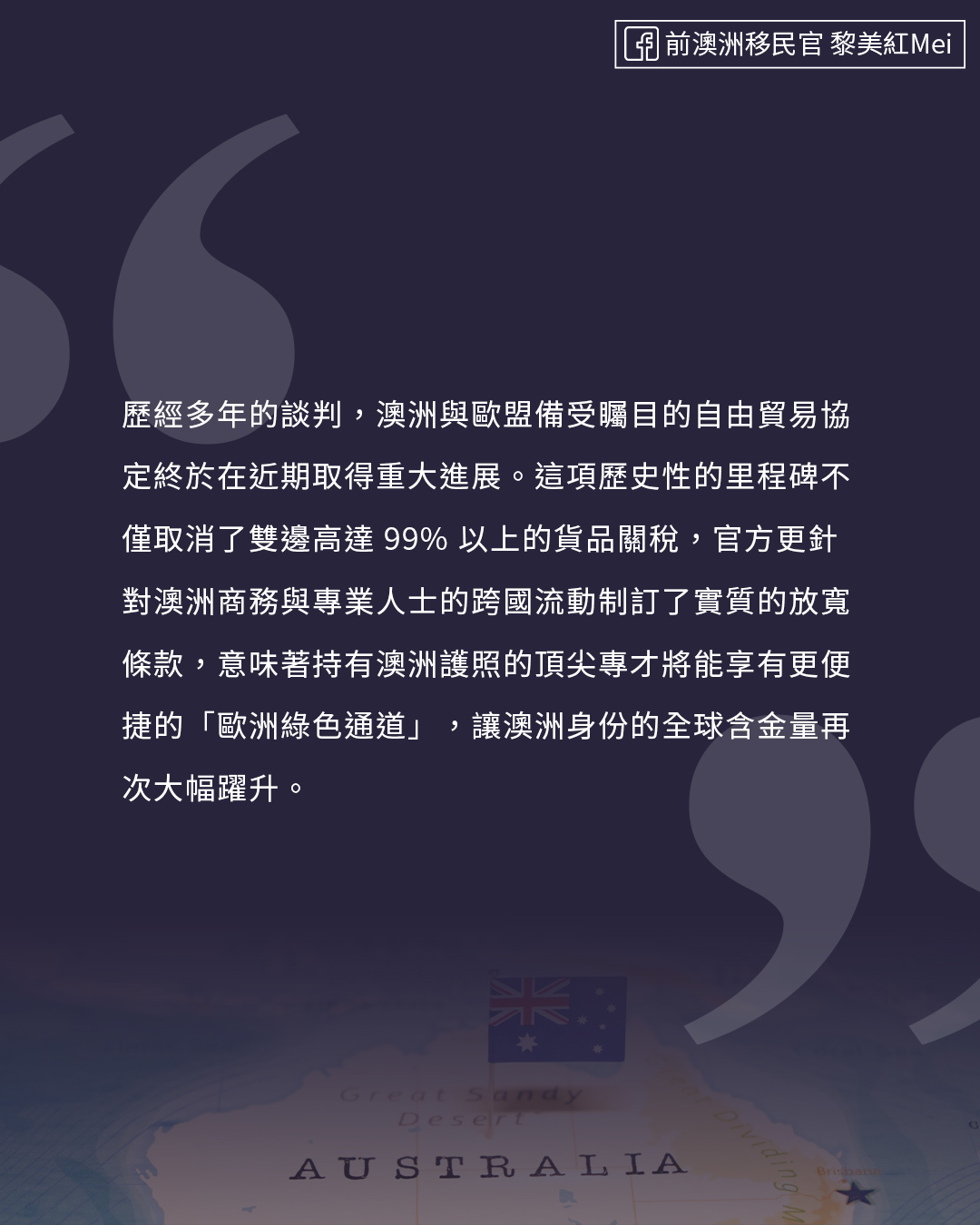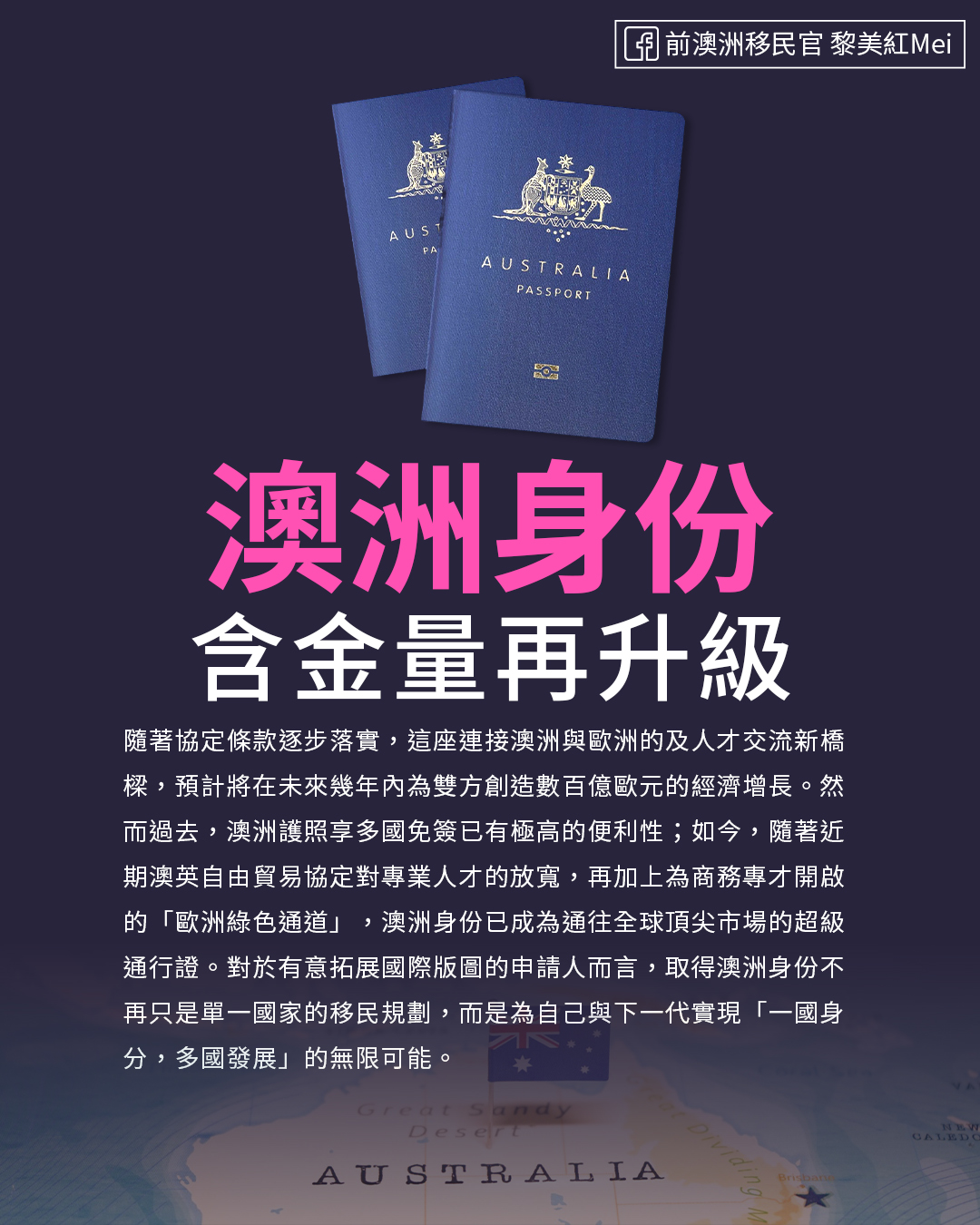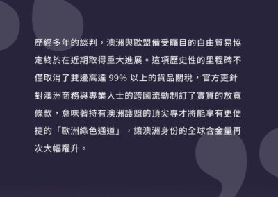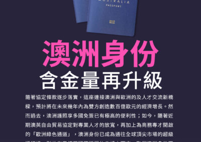 隨著協定條款逐步落實,這座連接澳洲與歐洲的及人才交流新橋樑,預計將在未來幾年內為雙方創造數百億歐元的經濟增長。然而過去,澳洲護照享多國免簽已有極高的便利性;如今,隨著近期澳英自由貿易協定對專業人才的放寬,再加上為商務專才開啟的「歐洲綠色通道」,澳洲身份已成為通往全球頂尖市場的超級通行證。對於有意拓展國際版圖的申請人而言,取得澳洲身份不再只是單一國家的移民規劃,而是為自己與下一代實現「一國身分,多國發展」的無限可能。