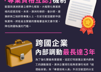 為了強化雙邊商業營運,協定訂明放寬企業內部員工的調動簽證。澳洲企業現在能夠更彈性地將「經理級高管」與「專業技術人員」外派至歐盟的分支機構或子公司,駐點時間通常可長達 3 年。這項條款將大幅提升澳洲企業拓展歐洲版圖的競爭力。