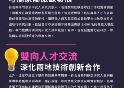 此外,協定亦建立了雙向的知識共享機制。符合資格的歐盟研究人員與技術專家將獲准來到澳洲,進行長達一年的技能交換及在職實習培訓。這項政策不僅有助於澳洲科研領域吸收歐洲頂尖的先進知識,也進一步深化了兩地在技術合作與交流,為澳洲本地產業注入國際化的競爭力。