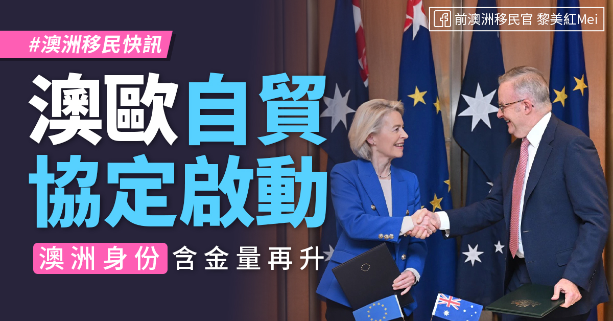 歷經多年的談判,澳洲與歐盟備受矚目的自由貿易協定終於在近期取得重大進展。這項歷史性的里程碑不僅取消了雙邊高達 99% 以上的貨品關稅,官方更針對澳洲商務與專業人士的跨國流動制訂了實質的放寬條款,意味著持有澳洲護照的頂尖專才將能享有更便捷的「歐洲綠色通道」,讓澳洲身份的全球含金量再次大幅躍升。