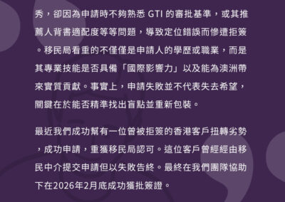 申請專才移民簽證時,不少申請人本身的履歷非常優秀,卻因為申請時不夠熟悉 GTI 的審批基準,或其推薦人背書適配度等等問題,導致定位錯誤而慘遭拒簽。移民局看重的不僅僅是申請人的學歷或職業,而是其專業技能是否具備「國際影響力」以及能為澳洲帶來實質貢獻。事實上,申請失敗並不代表失去希望,關鍵在於能否精準找出盲點並重新包裝。
