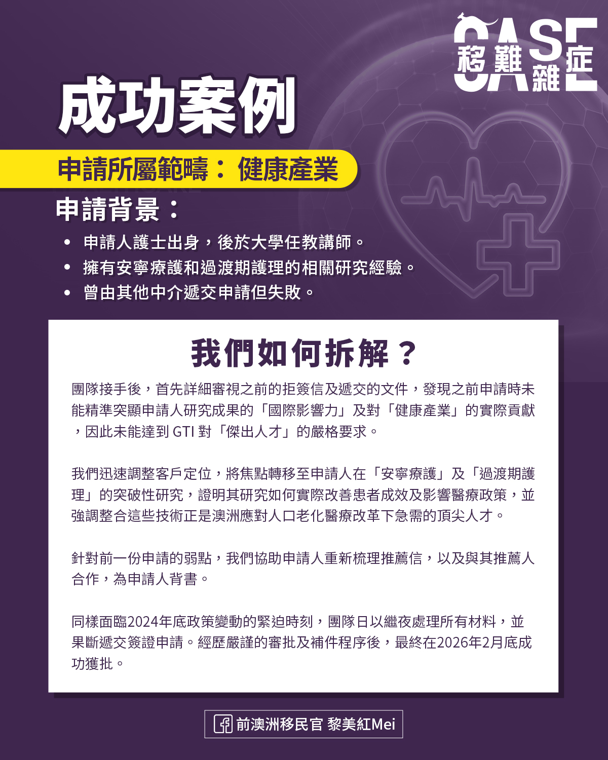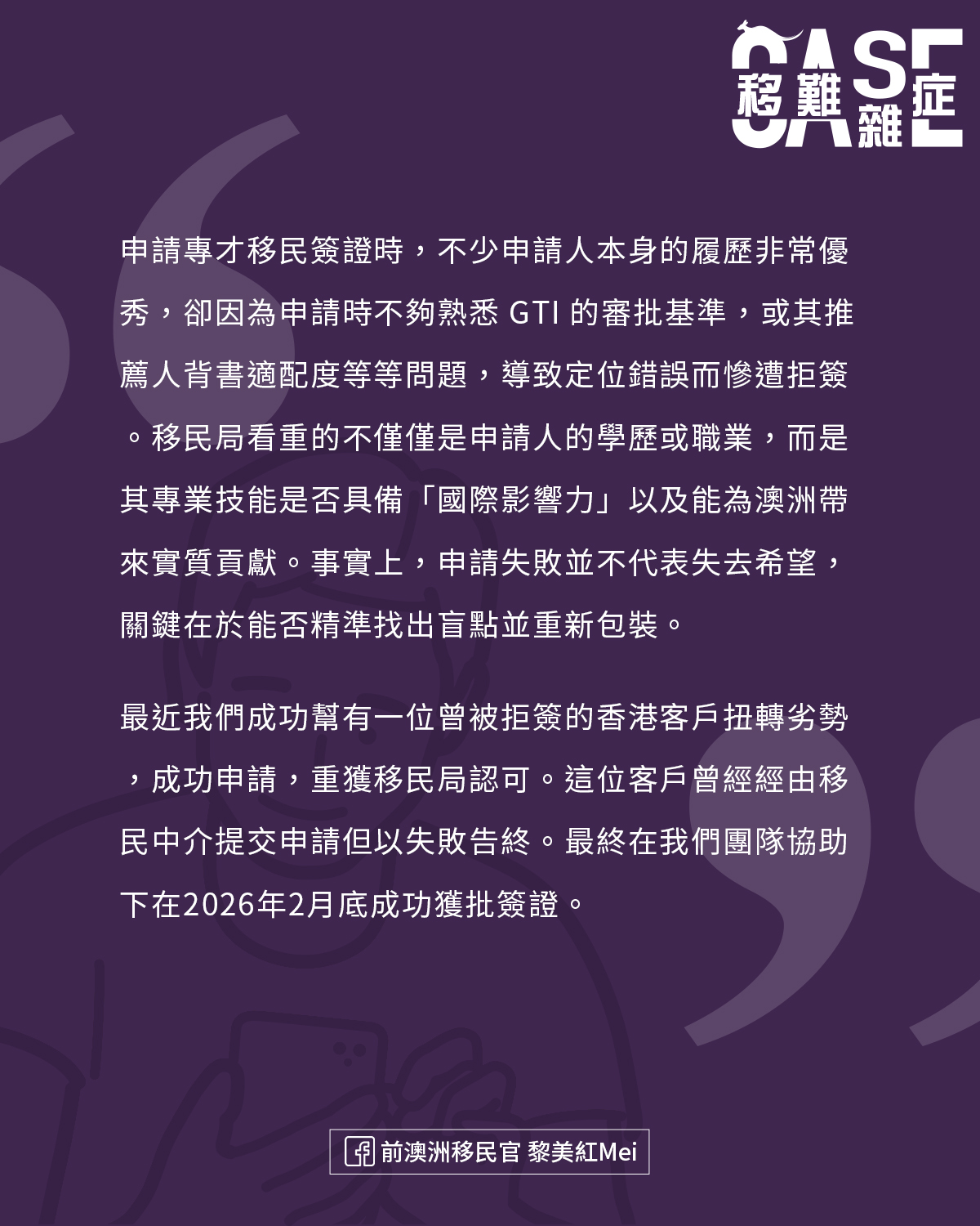 最近我們成功幫有一位曾被拒簽的香港客戶扭轉劣勢,成功申請,重獲移民局認可。這位客戶曾經經由移民中介提交申請但以失敗告終。最終在我們團隊協助下在2026年2月底成功獲批簽證,給大家做個參考: