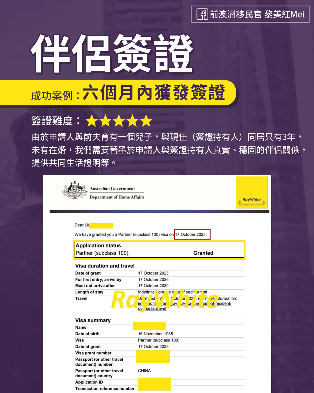 由於申請人與前夫育有一個兒子,與現任(簽證持有人)同居只有3年,未有在婚,我們需要著墨於申請人與簽證持有人真實、穩固的伴侶關係,提供共同生活證明等。