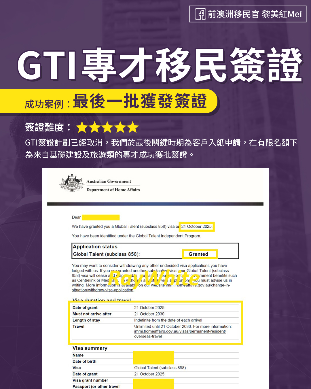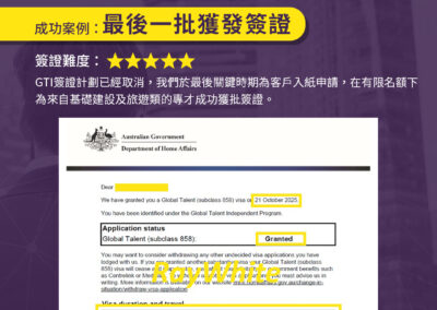 GTI簽證計劃已經取消,我們於最後關鍵時期為客戶入紙申請,在有限名額下為來自基礎建設及旅遊類的專才成功獲批簽證。