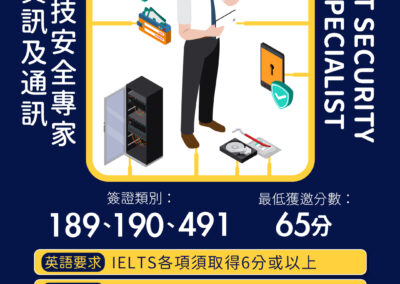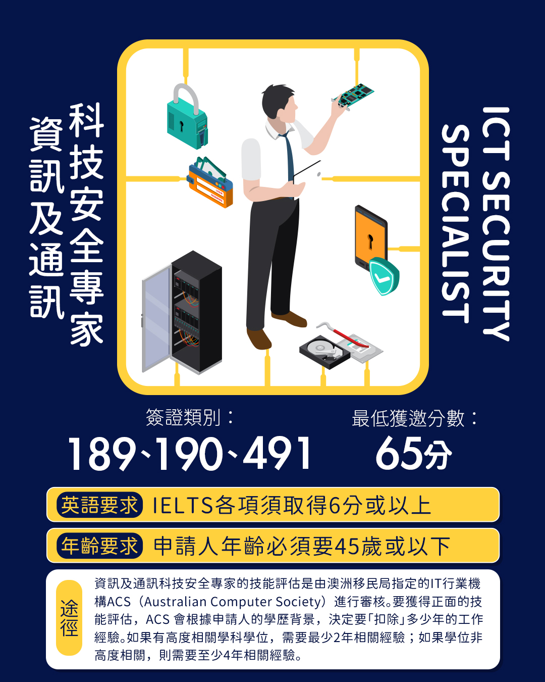 資訊及通訊科技安全專家(ICT Security Specialist)在中長期職業列表上,可以考慮以189、190及491等技術移民簽證移民澳洲。