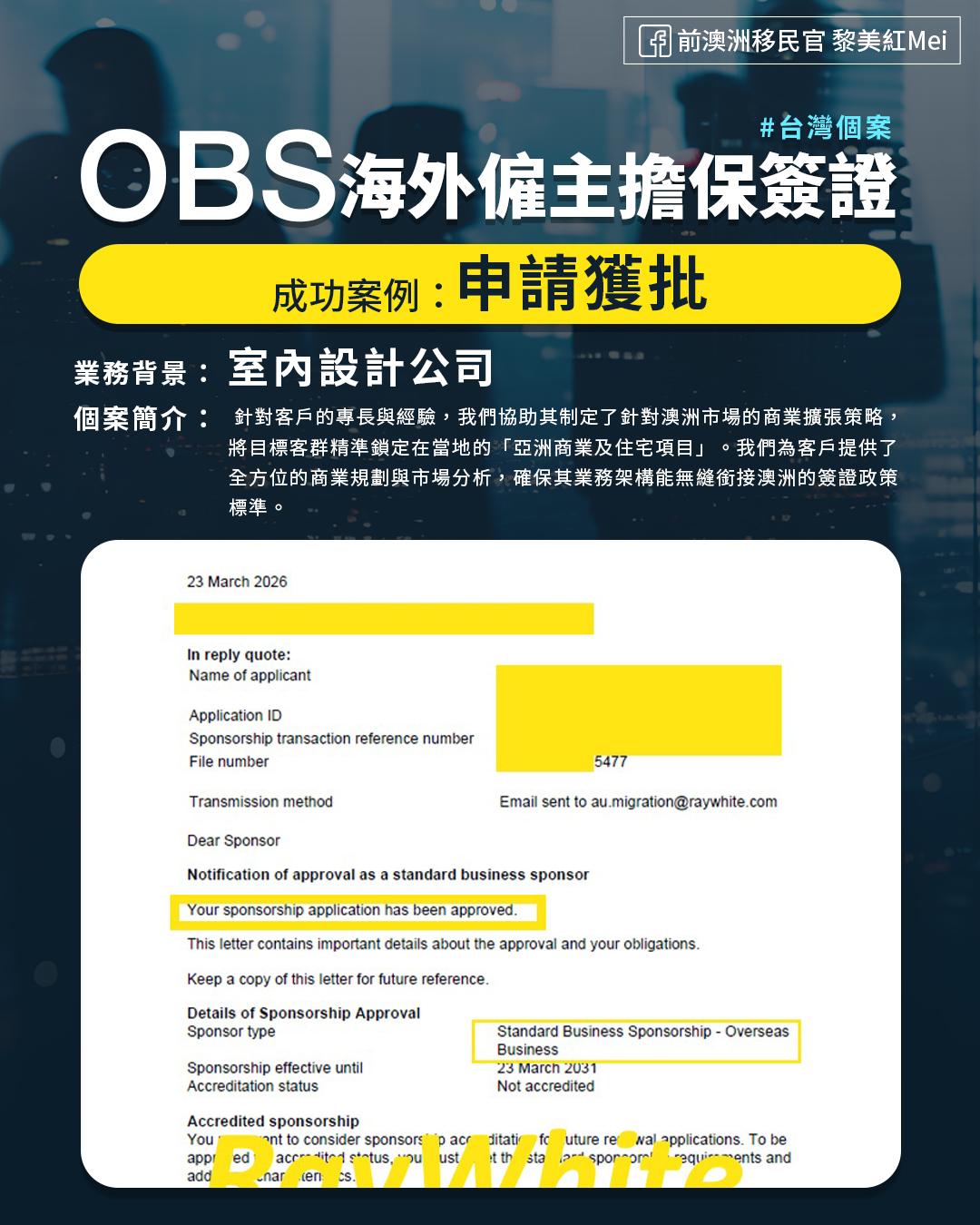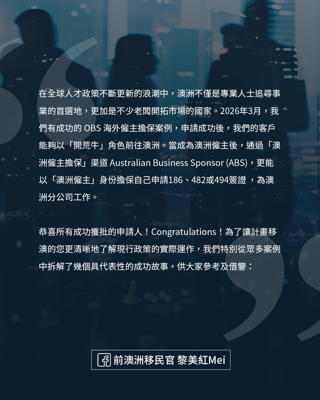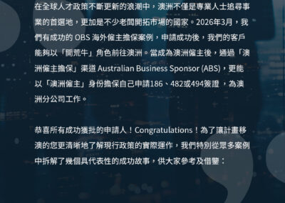 在全球人才政策不斷更新的浪潮中,澳洲不僅是專業人士追尋事業的首選地,更加是不少老闆開拓市場的國家。2026年3月,我們有成功的 OBS 海外僱主擔保案例,申請成功後,我們的客戶能夠以「開荒牛」角色前往澳洲。當成為澳洲僱主後,通過「澳洲僱主擔保」渠道 Australian Business Sponsor (ABS),更能以「澳洲僱主」身份擔保自己申請186、482或494簽證 ,為澳洲分公司工作。