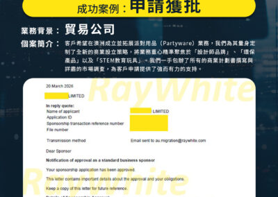 個案簡介: 客戶希望在澳洲成立並拓展派對用品(Partyware)業務,我們為其量身定制了全新的商業設立策略,將業務重心精準聚焦於「設計師品牌」、「環保產品」以及「STEM教育玩具」。我們一手包辦了所有的商業計劃書撰寫與詳盡的市場調查,為客戶申請提供了強而有力的支持。
