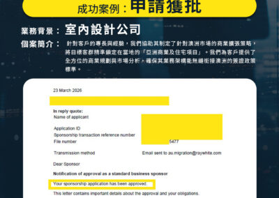 個案簡介: 針對客戶的專長與經驗,我們協助其制定了針對澳洲市場的商業擴張策略,將目標客群精準鎖定在當地的「亞洲商業及住宅項目」。我們為客戶提供了全方位的商業規劃與市場分析,確保其業務架構能無縫銜接澳洲的簽證政策標準。
