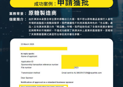 個案簡介: 由於澳洲本身是全球主要的原糖出口大國,客戶若以原有產品直接打入當地市場將面臨極大挑戰與競爭。我們建議客戶利用其極具特色的「冬瓜糖」產品,主攻澳洲高潛力的「精品糖」市場。我們協助完成了全套的商業計劃制定與精準的市場調研,不僅成功避開了與澳洲本土產業的直接競爭,更確保了其業務營運模式高度符合移民局的審批參數。